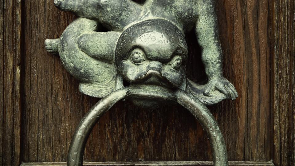 A door knocker is an item of door furniture that allows people outside a house or other dwelling or building to alert those inside to their presence. A door knocker has a part fixed to the door, and a part (usually metal) which is attached to the door by a hinge, and may be lifted and used to strike a plate fitted to the door, or the door itself, making a noise. The struck plate, if present, would be supplied and fitted with the knocker. Door knockers are often ornate, but may be no more than a simple fitting with a metal bob, or ring. German professor Franz Sales Meyer distinguished three kinds of door knocker: the "ring", the "hammer", and an ornate category which could take the shape of an animal or another figure. High demand for antique door knockers in the early 20th century in the United States caused forged versions to emerge.
